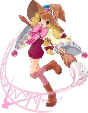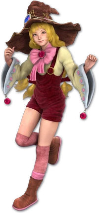 Beryl appears as a young girl with gray eyes and long blond hair that trails into three ponytails. She is fairly small for her age, and her personality tends to reflect this. Her attire consists of a cream-colored robe top and magenta-colored overalls adorned with a large pink ribbon. She wears a brown, witch-like hat, long pink socks, and brown boots.