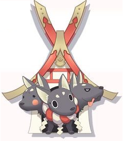 Cerberus appears as a small, three-headed gray dog, each face providing a different expression. He wears a shimenawa made of red and white rope as a collar with three shide streamers dangling from it and is always shown in front of his Japanese-themed doghouse. Each time Cerberus dies, he is reborn as the same being in the same place, and the flashback in which he is shown just happens to be around the time when he was a puppy. This results in him being depicted as lighthearted and playful, but also lonely. He frequently injects the verbal tic "wan", the onomatopoeia for a dog's bark in his speech.
