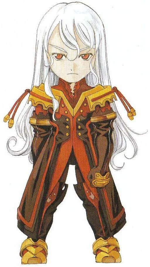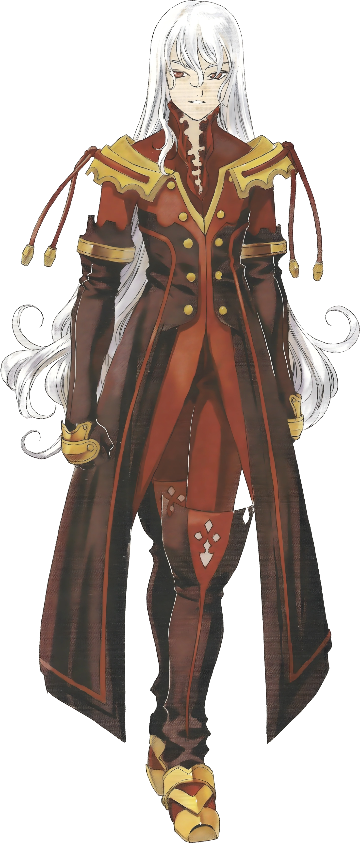 Duke has long white hair and red eyes. His uniform is mostly red and gold, concealing most of his body. Duke's brief appearances throughout the story make him out to be a solitary individual. He prefers taking matters into his own hands whenever he can, but is willing to lend the party aid, should their interests align. After the humans kill Elucifer, he permanently cut his ties with them, now seeing only their flaws.