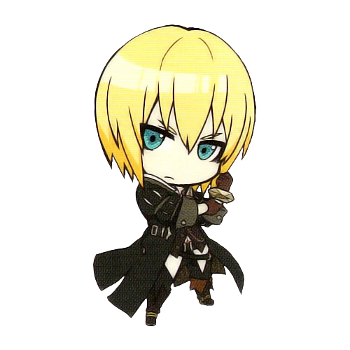 Eizen is a tall, built man, though he is noted to be less muscular and more slender than characters like Rokurou[10]. His blond hair, blue eyes and pale skin are similar to those of his sister, Edna. Eizen dresses roughly and in black, reinforcing the "Reaper" epithet. Other people often find him intimidating, such as when he teams up with Magilou for a comedy skit and the public is too afraid of him to laugh. The underlying theme of Eizen's outfit is that of a groom's suit[11], and the sleeves of the coat in particular are inspired by landsknecht[10].