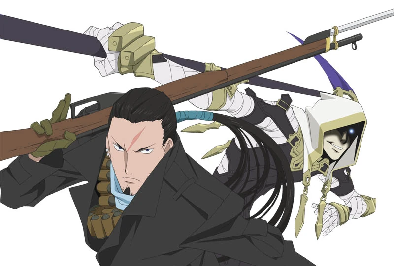 Hypnos is a tall, slender man whose face is mostly concealed with the white, gold-lined hood of his outfit. His eyes glow a sharp, piercing blue, mirroring the color of his two scythes. The remainder of his attire consists of a tight black suit worn over his default white attire, with gold plates of armor covering his hands, feet, elbows, and kneecaps. Although Hypnos appears little in the story due to this early-depicted death, he is shown to believe in Ratio's ideology of world separation and deeply care about his brother, the latter of which carries over into his next life as Ricardo.