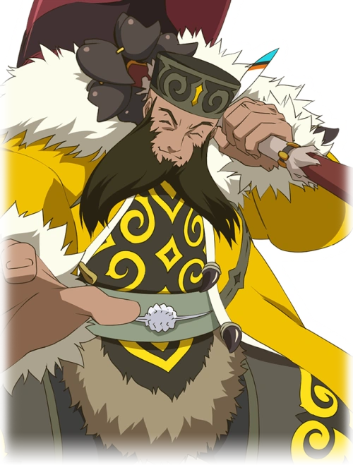 Jiao's appearance is the same in Tales of Xillia and its sequel. He is a considerably tall and bulky man. Jiao is bald but has a long brown beard that parts distinctly, as well as brown eyes, which he rarely opens very widely. He wears a large yellow coat with white fur, as well as a black- and yellow-patterned shirt with fur at the bottom. The same fur can be found on his legs, accompanied by two large pieces of leg armor that share a similar black and yellow pattern as his torso. He wears light brown boots that extend into a black-laced material up to his knees. Jiao's attire is completed by a black round hat with a yellow design and a feather that protrudes from the left side.