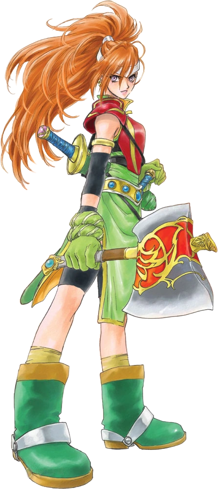 Suffering from amnesia, 24-year-old Mary is not aware of her last name due to an unknown event in her past. She is usually quiet and does not show much emotion, but she can fly into a wild frenzy during battle. Her partner, Rutee Katrea, uses Mary for her own financial gain. Stahn Aileron first encounters both Mary and Rutee on the Flying Dragon ship Draconis, where Mary drags Rutee to an escape pod just as the ship's engine begins to fail due to an unprecedented onslaught of monsters. Mary later joins forces with Stahn in Janos to rescue Rutee, who has fallen into a trap in a nearby ruin.