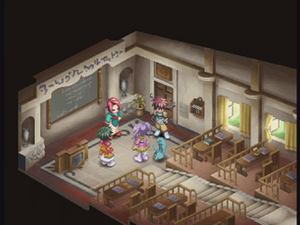 Meredy, who notes that the translation is taking too long, observes a poster depicting the whole of Eternia and gestures to the others that Celestia and Inferia will make "boom". This is the first time Meredy is able to clearly indicate the happenings of the Grand Fall to the group. Keele then draws the group's attention to the dark matter in the Orbus Barrier, which is swelling and indicating disastrous consequences. He proposes that they visit Morle, where is former professor lives.