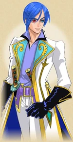 Sauber has medium-length, vibrant blue hair that is combed back neatly, with a single strand falling over his face. His right eye is distinctly red, contrasting with his other eye, which matches with his hair color. He is dressed in a long, fitted white coat with prominent blue and gold accents. It features a high, black-lined collar with a gold trim and angular patterns. Under his coat is a light-lavender shirt, complemented by a purple belt with a gold buckle. At his sides are two katanas, their hilts decorated with ornate patterns. Finally, he has black gloves covering his hands.