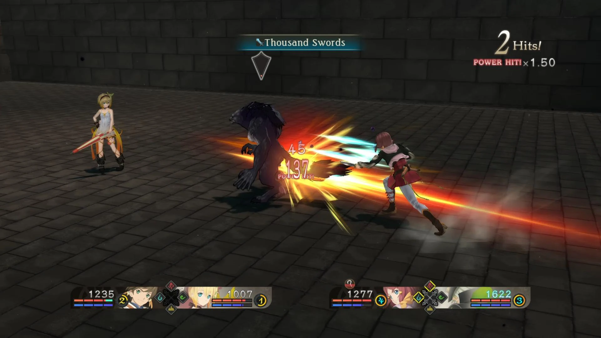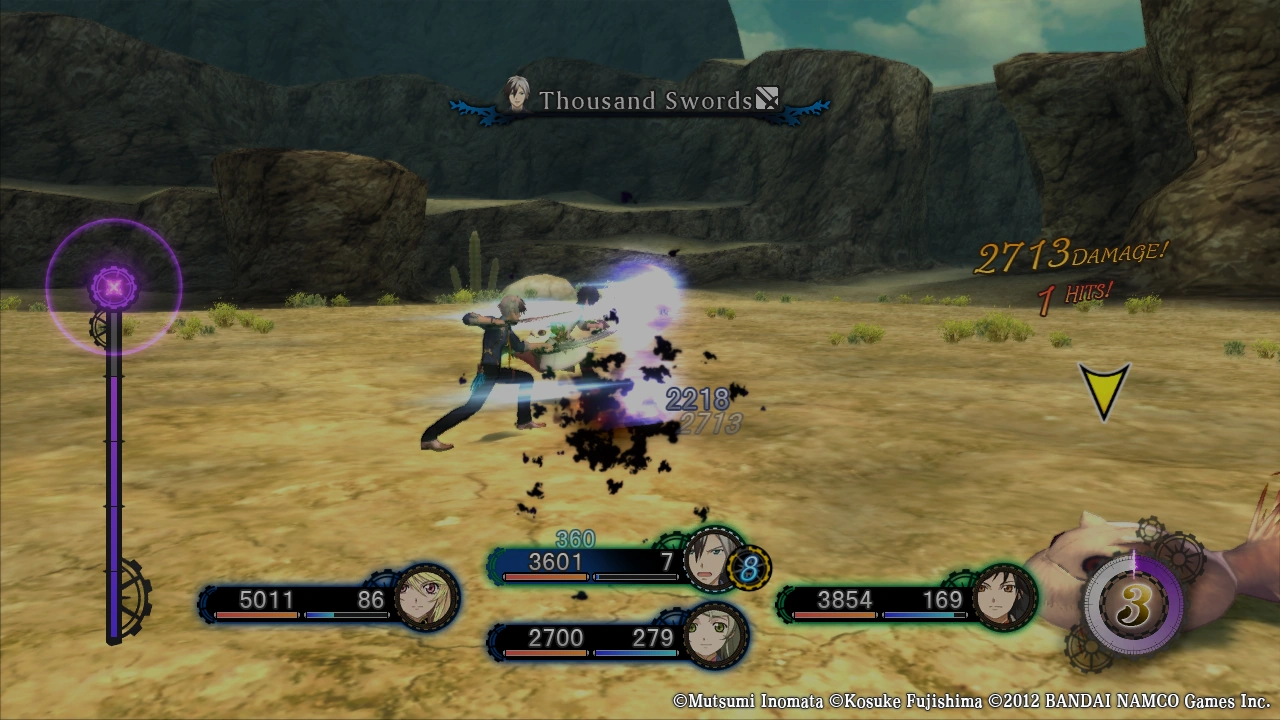 Thousand Swords (刺宴 Shien?, "Cutting Feast") is a strike arte used by Ludger Will Kresnik and Victor from Tales of Xillia 2 and Rose in Tales of Zestiria.